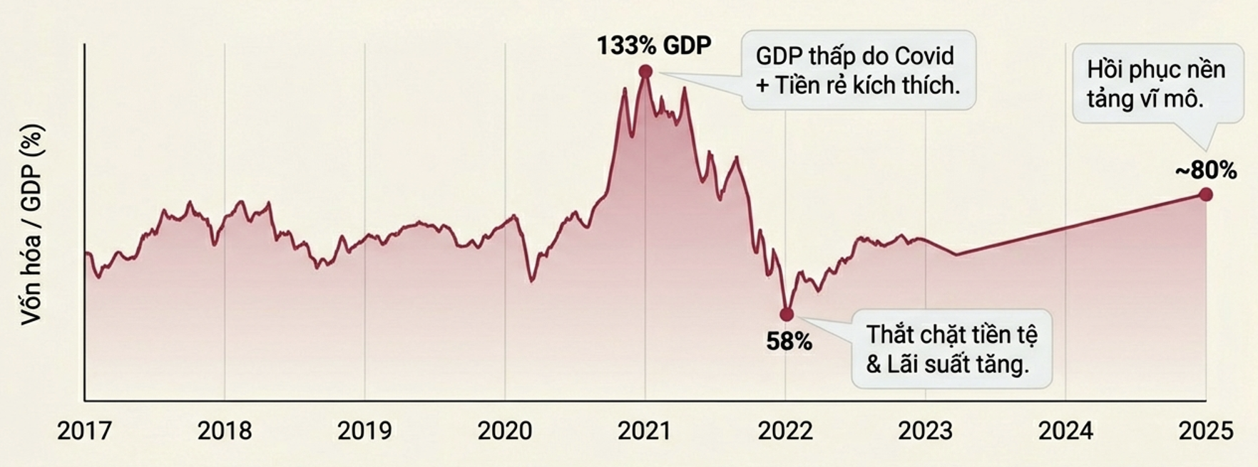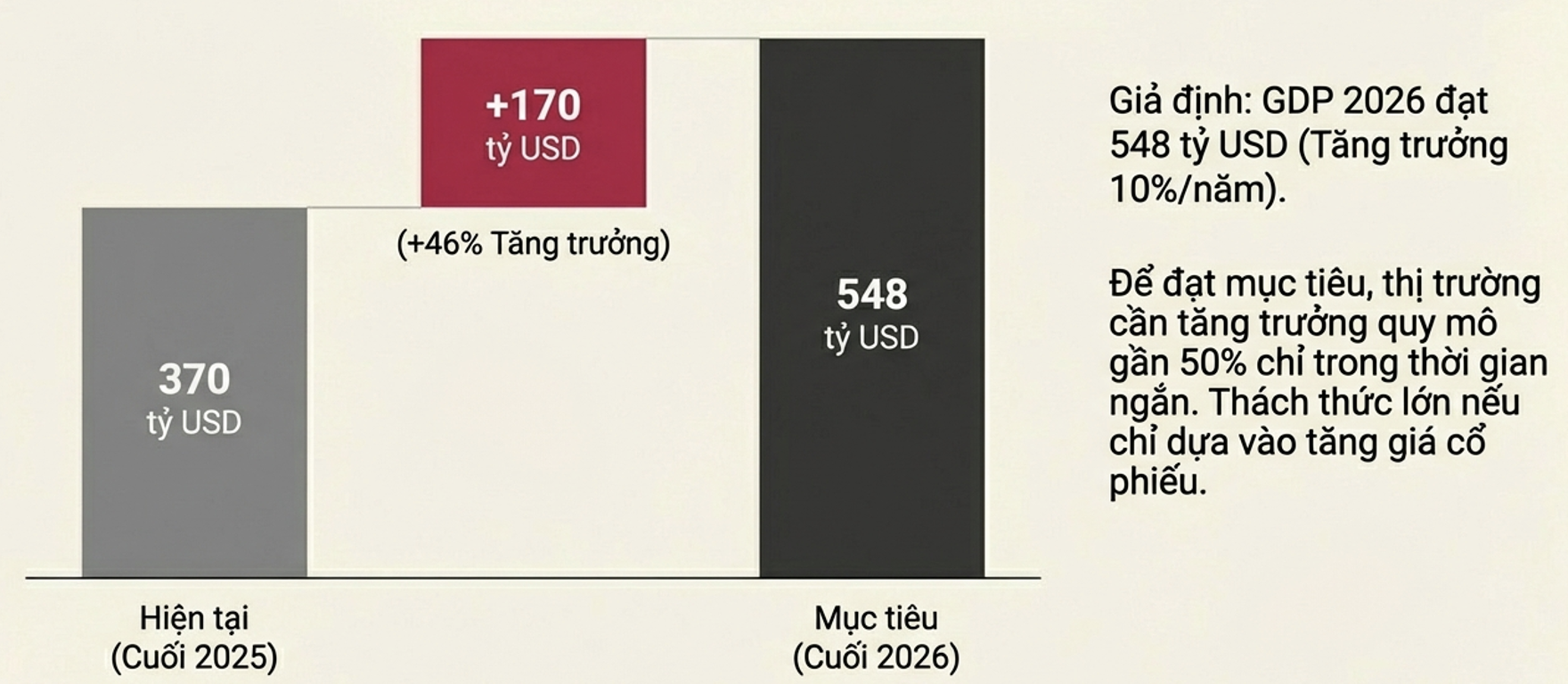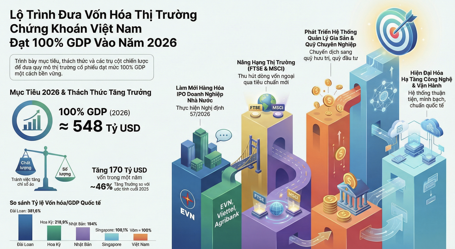 Để thị trường chứng khoán Việt Nam đạt quy mô ít nhất 100% GDP một cách bền vững, trọng tâm không chỉ nằm ở việc đạt được bề nổi của con số mà là phải nâng cao chất lượng của cả nền kinh tế (mẫu số GDP) và quy mô vốn hóa thị trường (tử số).