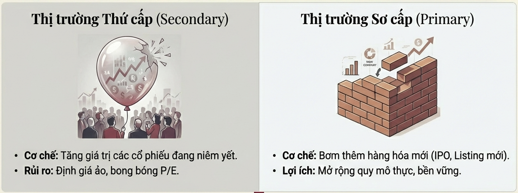 Để đạt được tỷ lệ 100% một cách thực chất, vốn hóa thị trường không thể dựa vào các thủ thuật "kéo giá" hay đẩy giá một vài mã cổ phiếu trụ cột. Thay vào đó, thị trường cần phát triển dựa trên hai con đường: gia tăng lượng hàng hóa trên thị trường sơ cấp (phát hành mới) và tăng trưởng giá trị doanh nghiệp trên thị trường thứ cấp.