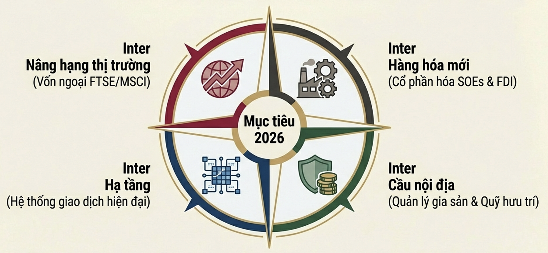 + Nâng hạng thị trường và thu hút vốn quốc tế: Đưa thị trường chứng khoán Việt Nam chính thức được nâng hạng (bởi các tổ chức như FTSE hay MSCI) để thu hút dòng vốn lớn và dài hạn từ các nhà đầu tư nước ngoài.